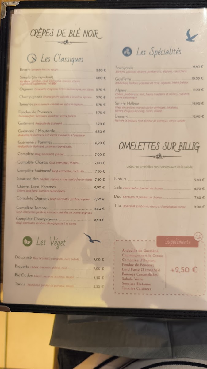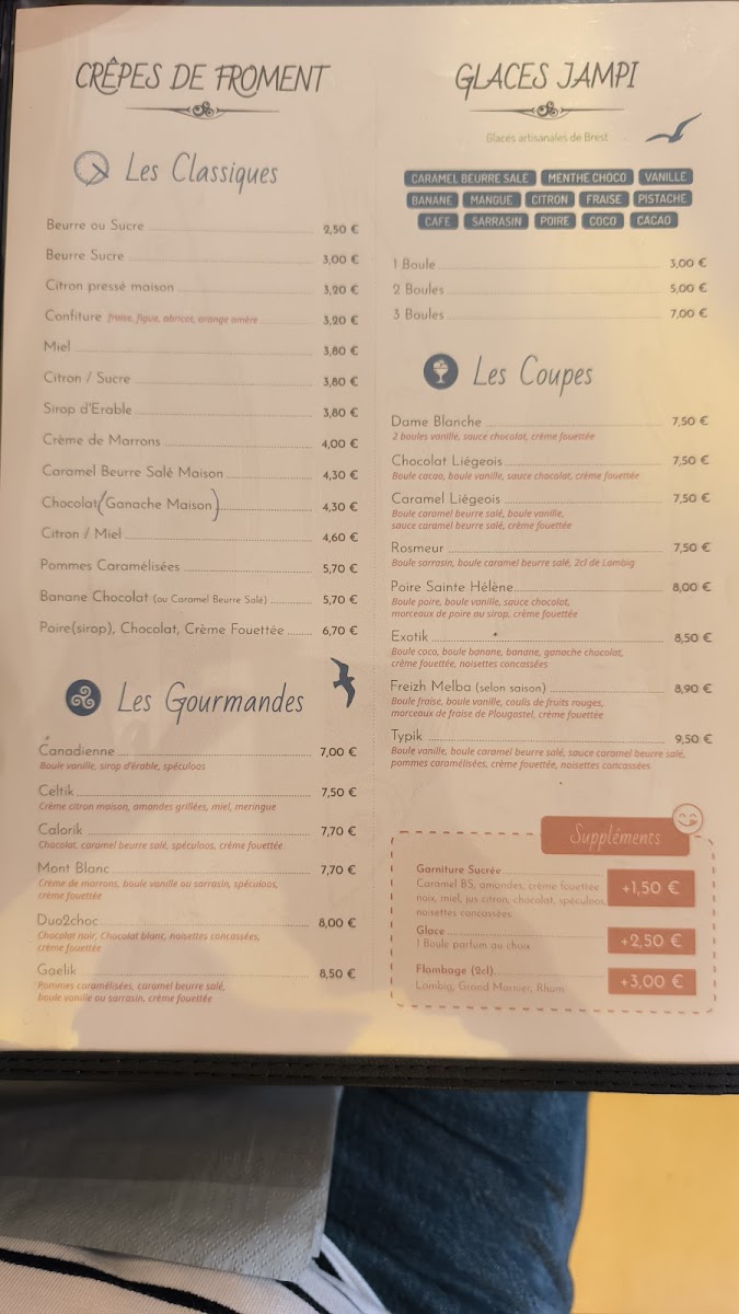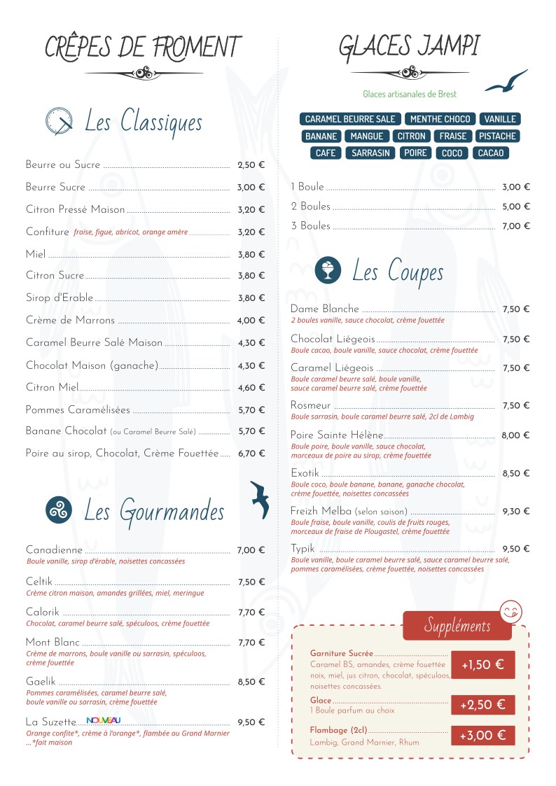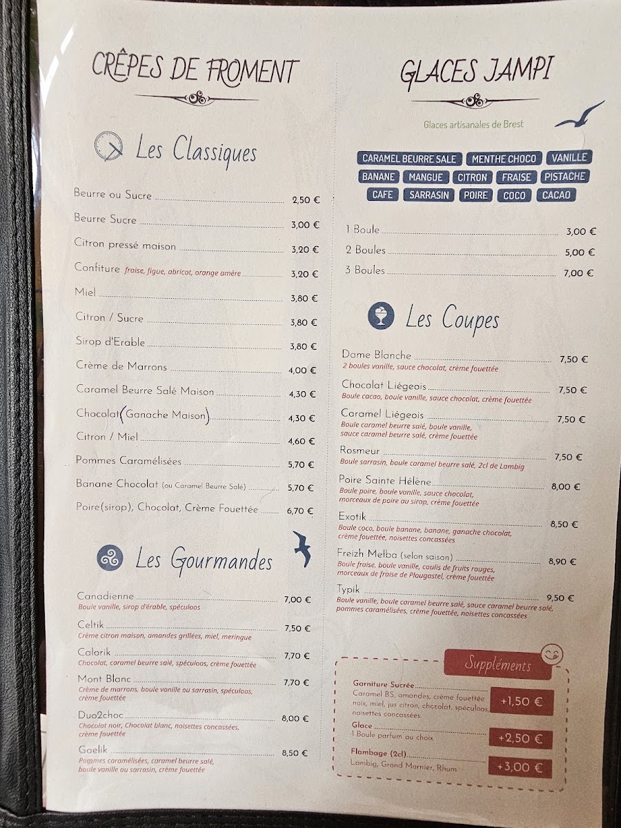 The menu at Auprès De Ma Crêpe offers a delightful array of both savory and sweet crêpes, showcasing traditional Breton flavors with a touch of innovation. One of the standout dishes is the Complète Sainte Hélène, a savory crêpe filled with ham, cheese, and a perfectly cooked egg, bringing together simple ingredients in a way that feels comforting and satisfying. The restaurant also features a variety of other savory options like the Complète Bretagne, which is made with smoked salmon, cream cheese, and fresh herbs, offering a more refined take on the classic crêpe. For those with a sweet tooth, the menu boasts indulgent desserts, including the Crêpe Douceur, a delicious crêpe filled with caramelized apples and drizzled with rich caramel sauce. Whether you're in the mood for a hearty meal or a sweet treat, the menu at Auprès De Ma Crêpe delivers a perfect balance of flavors, with each dish made from fresh, high-quality ingredients.