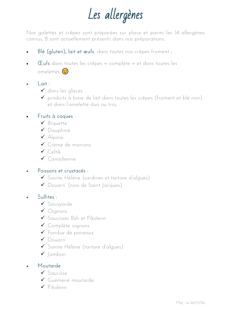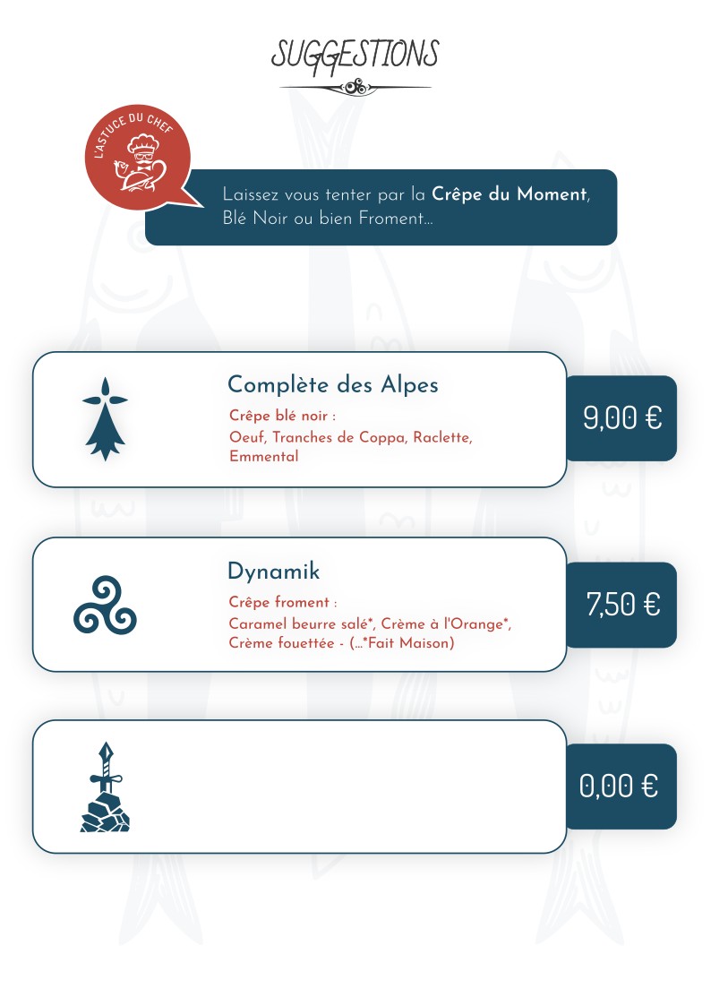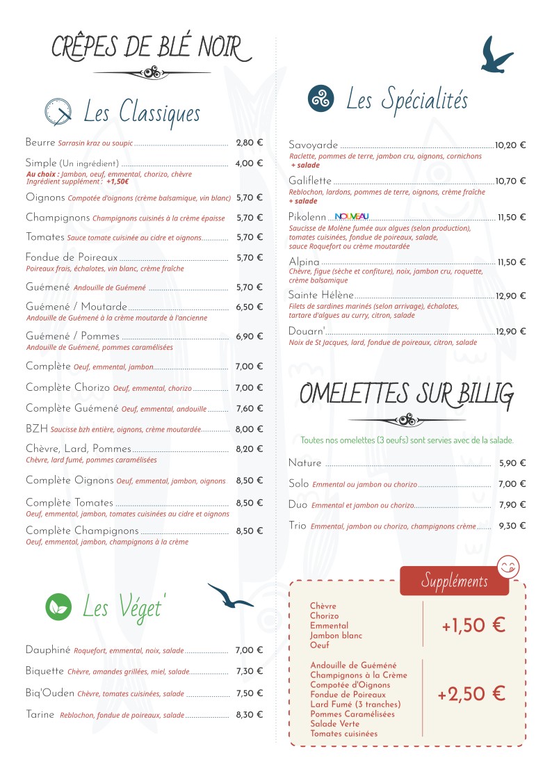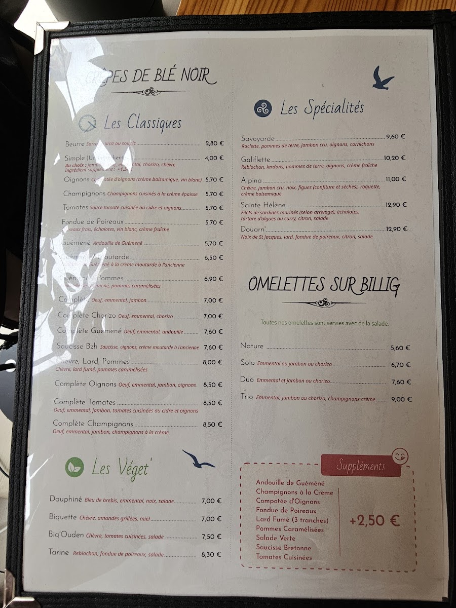 The menu at Auprès De Ma Crêpe offers a delightful array of both savory and sweet crêpes, showcasing traditional Breton flavors with a touch of innovation. One of the standout dishes is the Complète Sainte Hélène, a savory crêpe filled with ham, cheese, and a perfectly cooked egg, bringing together simple ingredients in a way that feels comforting and satisfying. The restaurant also features a variety of other savory options like the Complète Bretagne, which is made with smoked salmon, cream cheese, and fresh herbs, offering a more refined take on the classic crêpe. For those with a sweet tooth, the menu boasts indulgent desserts, including the Crêpe Douceur, a delicious crêpe filled with caramelized apples and drizzled with rich caramel sauce. Whether you're in the mood for a hearty meal or a sweet treat, the menu at Auprès De Ma Crêpe delivers a perfect balance of flavors, with each dish made from fresh, high-quality ingredients.